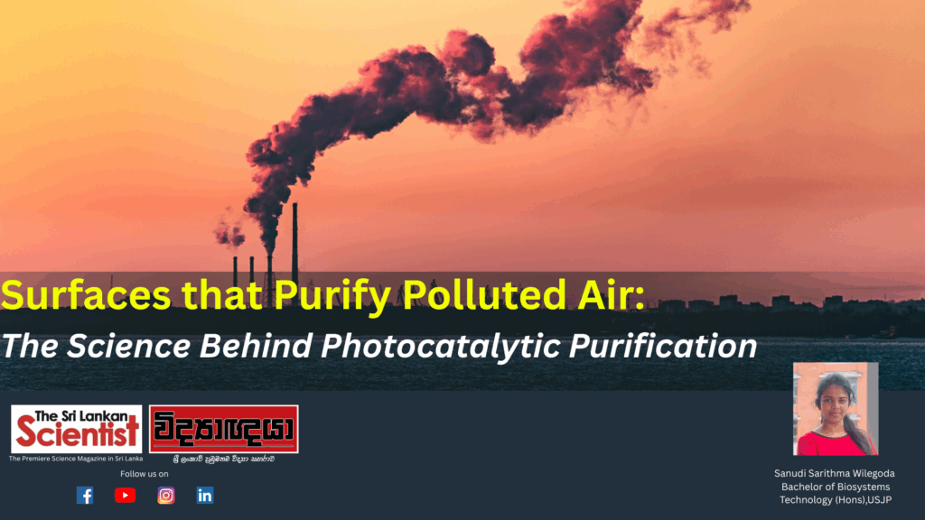 Normally, traditional air purifiers (electrostatic smoke precipitator) consume a significant amount of energy and may produce ozone as a harmful byproduct. Mostly, these methods require frequent maintenance with extra operational costs. And also, they are designed for small indoor environments, not suitable for scalable large areas or outdoor use. But photocatalytic oxidation is an efficient technique for removing organic pollutants from the air. Photocatalysts are semiconductors that catalyse reactions when exposed to light. The photoelectrochemical properties of TiO2 are the basis of modern photocatalysis techniques. TiO2 has shown several advantages, including low energy consumption, exceptional efficiency, resistance to acids, ease of production, strong oxidizing ability, chemical stability and insolubility in water. Photocatalysts are involved in accelerating the oxidation process under light irradiation. The process involves interactions between light irradiation and the photocatalyst, generating reactive species that oxidize and break down organic molecules. When protons from the light source strike the photocatalytic surface, electrons within the catalyst react and create electron-hole pairs. These pairs lead to the oxidation process. That holes react with water molecules and produce hydroxyl radicals, while the electrons reduce oxygen molecules to form superoxide anions. Both species accelerate the degradation of pollutants, like organic pollutants.